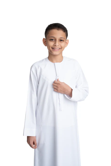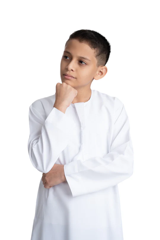 Introducing our Boys Basic Pink Emirati Jubba, the epitome of luxury and sophistication. Hand-crafted in the UAE as part of our new RM24 Hub Alhaya Basics collection, this authentic piece features a round collar, chest zip, and exquisite hand-stitched embroidery on the chest and wrist. Made from our exclusive soft polyester fabric, elevate your wardrobe with this standout piece. Match this with our adult basic white thobe.