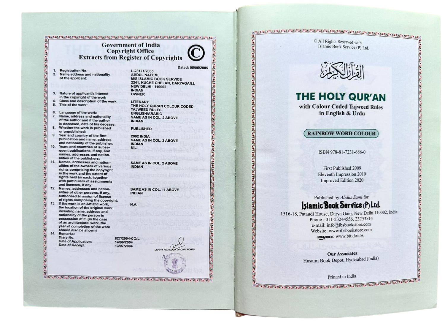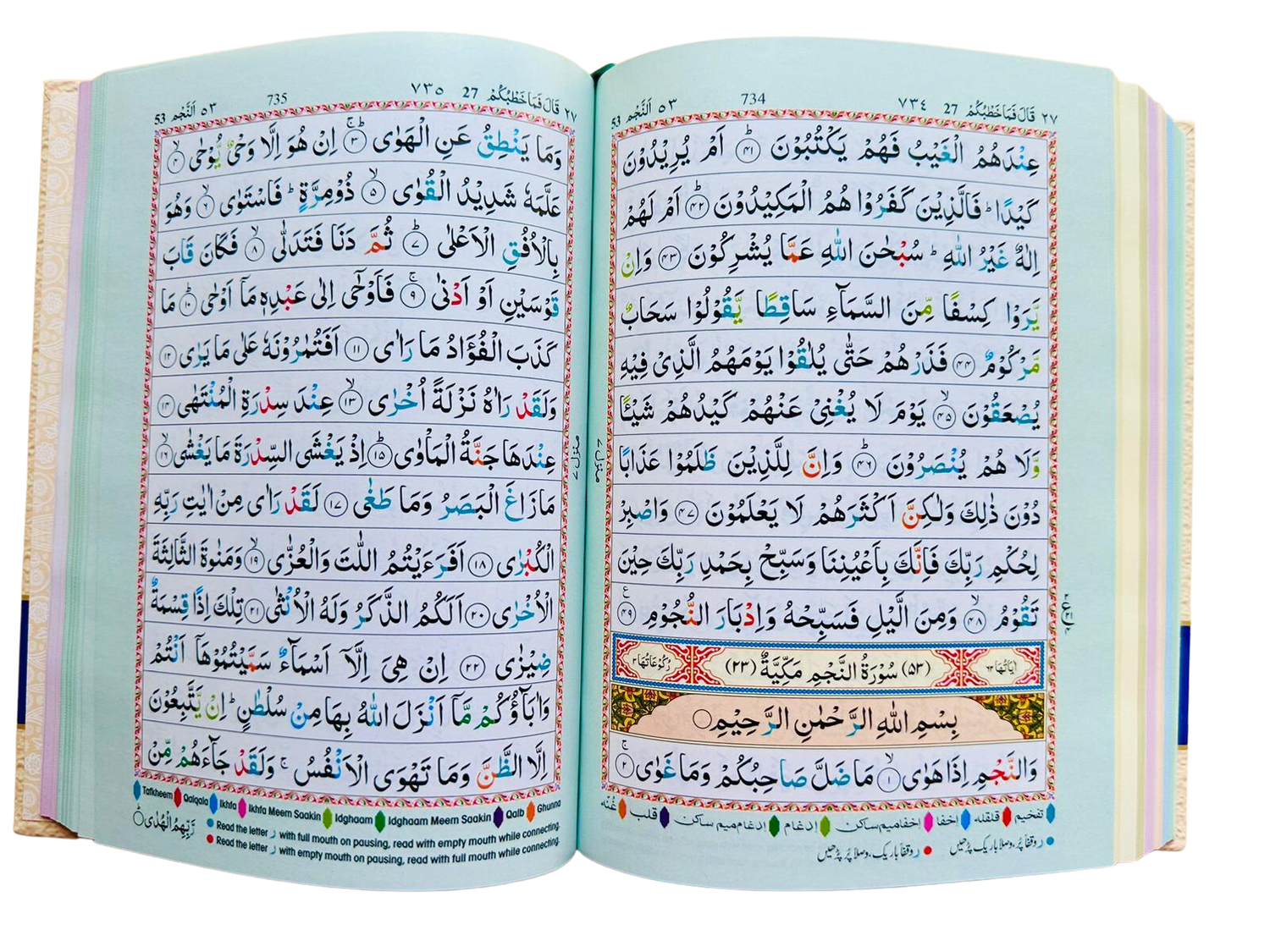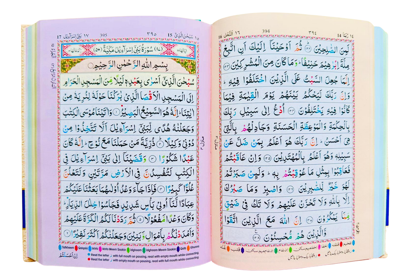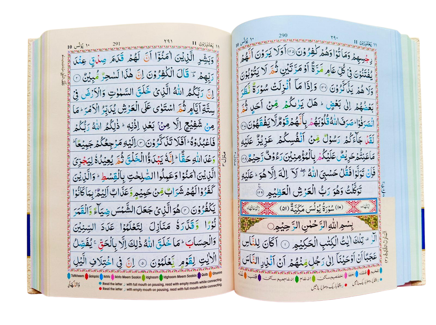 A color-coded Qu’an in an Arabic script that is easy to read for the non-Arabic speaking person as well. Seven different-color shades have been used: each color representing a different tajwid rule. Letters are coloured according to the corresponding tajweed rule. The actual rules of tajwid in English are included in the back of the Quran. This edition of the Qur’an can help those who desire to recite the Qur’an correctly with the proper pronunciations and intonations.