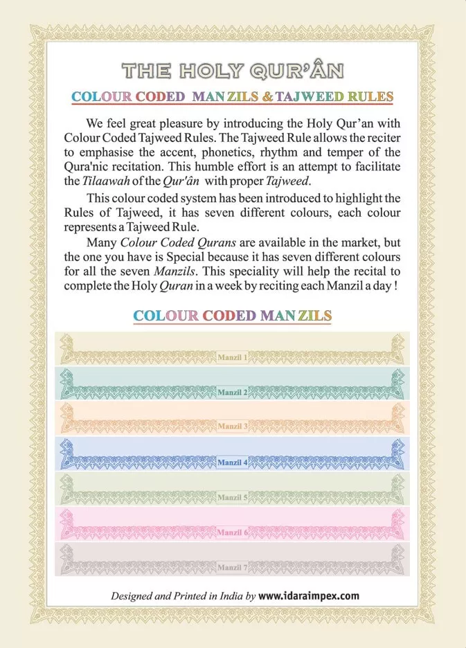 - Title: Holy Quran with Colour Coded Tajweed Rules & Manzils