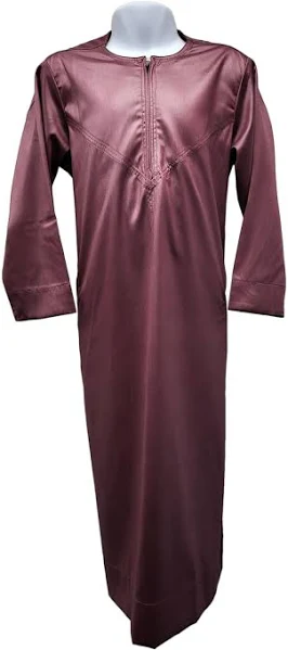 This plain Burgundy Emirati thobe features a zipped opening and minimalist stitching on the chest and arms. The v-shaped design keeps this thobe from looking too plain and can make you look slimmer by directing the eyes up and down as opposed to side-to-side. The shiny design of this thobe makes it perfect for parties. Wear it with a cream-coloured waistcoat or alone with a contrasting hat or Emirati headdress for special occasions.